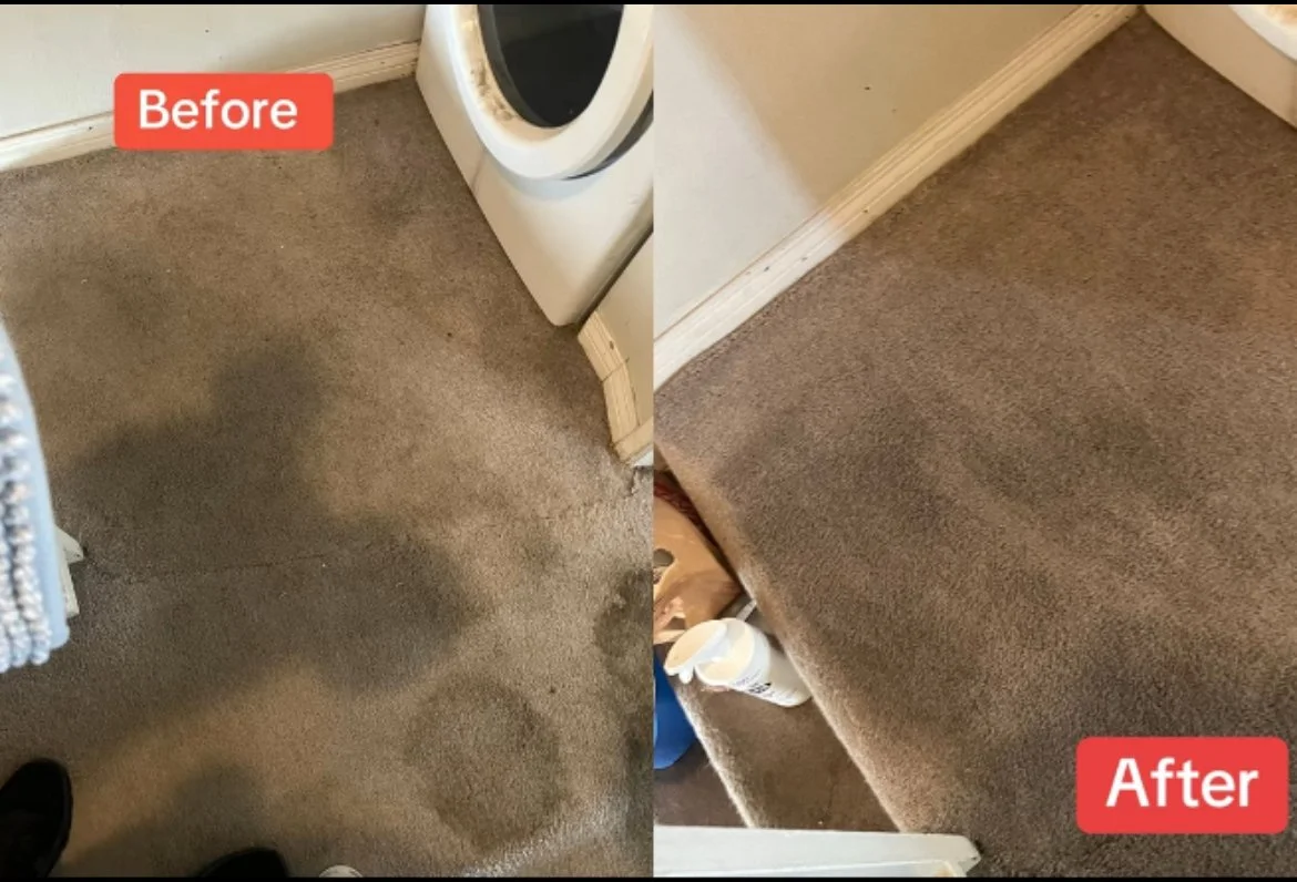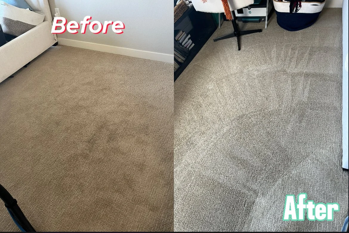 Comparison of a carpeted floor before and after cleaning, with the 'Before' side showing darker stained carpet and the 'After' side showing a cleaner, lighter carpet.