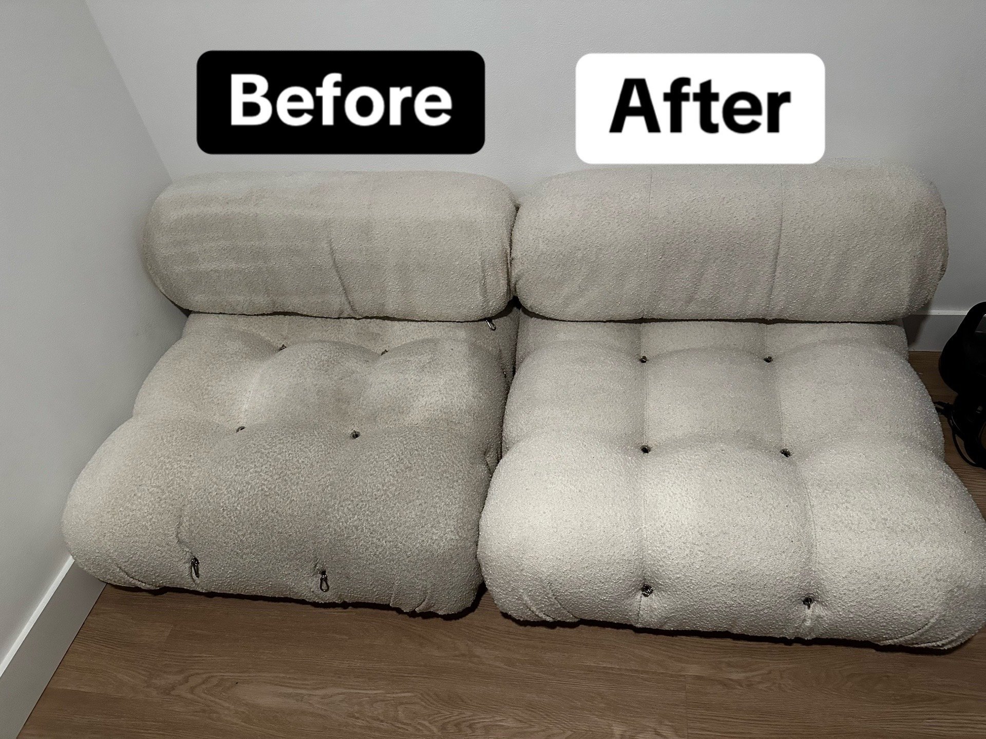 Comparison of a beige, textured sofa before and after cleaning or fixing, with labels 'Before' and 'After'.