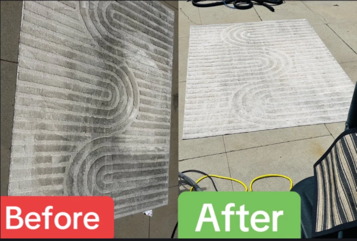 Comparison of two rugs on a tiled floor, showing a cleaned rug on the right labeled "after" and a dirty rug on the left labeled "before."