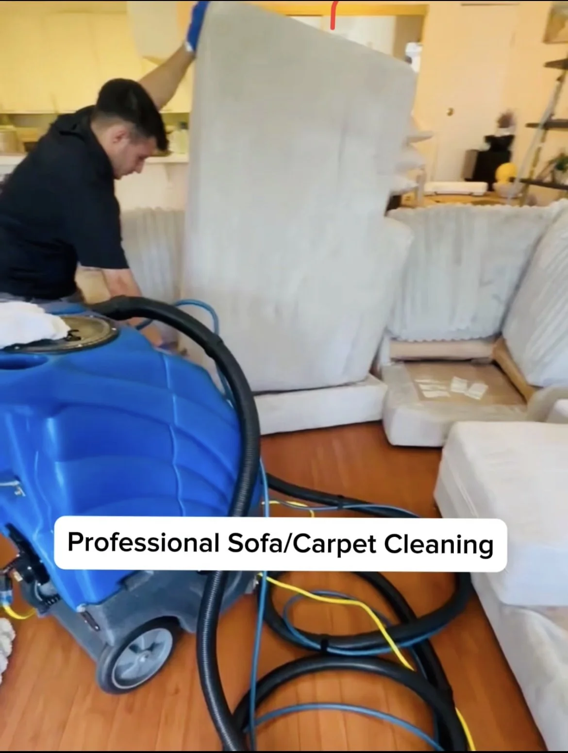 A person cleaning a beige sofa with a professional cleaning machine in a living room, with the text 'Professional Sofa/Carpet Cleaning' overlayed on the image.