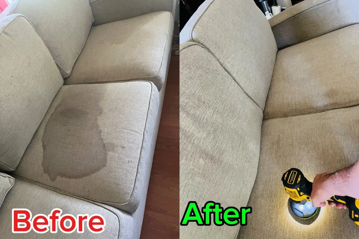 Comparison of a beige fabric couch before and after cleaning. The left side shows a couch with a large water stain, while the right side shows the same couch cleaned with a handheld device.